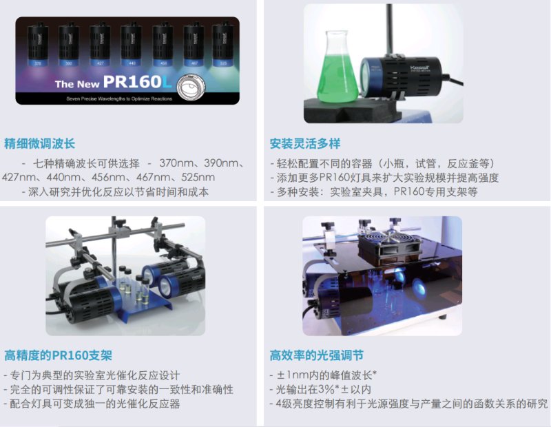 轻松配置不同的容器(小瓶,试管,反应釜等),添加更多PR160灯具来扩大实验规模并提高强度,多种安装:实验室夹具,PR160专用支架等。