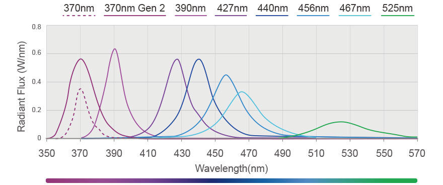 | 370nm/390nm/ 427nm/ 440nm/ 456nm/467nm/525nm/640nm/740nm |